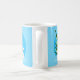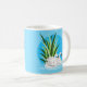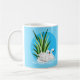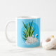 Un par de cisnes mute en el agua con fondo azul y gran follaje verde largo detrás