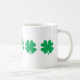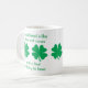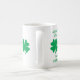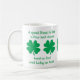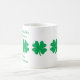 Esta mejor taza de amigo tiene cuatro tréboles de hojas verdes contra un fondo blanco, y el dicho: Un buen amigo es como un trébol de cuatro hojas - difícil de encontrar y afortunado de tener.