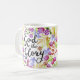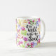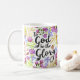 Front of mug tiene diseño moderno de tipografía con letras a mano con palabras, "Está bien con mi alma" palabras del conocido himno. El tipo está rodeado por coloridos bordes de flores acuáticas por todos lados. La espalda tiene un patrón de flores duplicado con palabras, "Para Dios sea la gloria" en el mismo estilo.