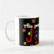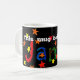Si su nombre es James, reivindique su propiedad de esta taza brillante y colorida con su nombre en letras de collage de papel pintadas a mano, sobre un fondo negro, salpicado de estrellas amarillas, naranjas y rojas. Las palabras, 'Esta taza pertenece a...' están escritas en blanco justo debajo del borde.