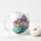 Gatito adorable del tabby que toma una siesta en una taza de té azul del lunar, pintada por el artista Maryline Cazenave