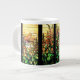 La reproducción magnífica del vitral de Nouveau del arte del vintage de un jardín de flores del Hollyhock con un jardín de piedras con la corriente en el arte del fondo está en esta taza enorme. 20 onzas de líquido que se calienta para esos días y noches fríos.
