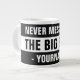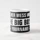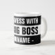 "Nunca te metas con el gran jefe" con tu nombre - pero puedes editar todo el texto para crear una taza única. También puede cambiar el color de fondo negro, así como los tamaños de fuente y colores, a cualquier color que desee utilizando la función "personalizar".
