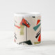 Cada día puede ser una ráfaga a partir del pasado con esta taza enorme inspirada moderna de los mediados de siglo. Las características del diseño una reproducción de un modelo móvil atómico de la tela del vintage. El fondo es ecru con formas azules, anaranjadas, verdes y negras del arte moderno.