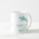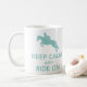 La calma y el paseo de la custodia en mantra se ha adaptado para el equestrian en su vida del poster de WWII. Atracción de una silueta de un caballo y de un jinete del puente del cazador sobre el texto en obra clásica, aguamarina. Una taza perfecta para comenzar su día.