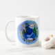 La taza tiene una divertida y colorida pintura del mundo que muestra las imágenes de un oso polar, oso panda y ballena azul. El texto pintado a mano recorre el mundo y dice: "Nuestras opciones, su futuro" con flechas de reciclaje que separan el texto. Esta taza es un recordatorio ambiental amistoso de nuestra responsabilidad de ayudar a mantener la salud del planeta.