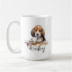 Una taza de café matutina con un beagle cachorro con nombre personalizado en estilo de guión. "Que tu café sea más fuerte que la actitud de tu perro" está escrito en la espalda. Un regalo perfecto para los dueños de perros que tienen un perro con actitud y también les encanta el café.