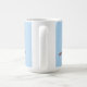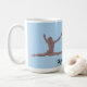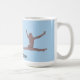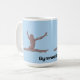 Gimnasta saltando por el aire. La fotografía está alterada para parecer terracota en bajo relieve. La imagen se duplica en cada lado de la taza. El color es un púrpura rosado, o malva, con un fondo azul claro. "Gimnasia" está centrado en la parte inferior.