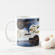 Taza clásica, adornada con una imagen de guitarras eléctricas hermosas - los left and right, se separaron por los Clefs y los Rótulos musicales.