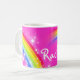 Arco iris brillante y colorido "que sus" niños conocidos asaltan. Regalo perfecto para un niño vibrante. La taza lee: "Raquel" o personaliza esta taza con el nombre de su opción hasta 6 letras. Taza diseñada exclusivamente por Sarah Trett.