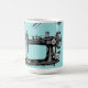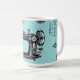 Las grandes imágenes del vintage de una máquina de coser, de una forma del vestido del alambre, de un hilo, de tijeras, de un dedal y de un botón antiguos contra un fondo en colores pastel del lunar de la aguamarina crean sutil esta diversión y diseño nostálgico, perfectos para una costurera, un sastre, una modista o un amante de artículos vintages. Elija su estilo de la taza, incluyendo una taza del viaje. Este diseño está también disponible en un caso del iPhone, una manga del ordenador portátil y más en mi tienda de Zazzle.