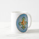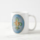 Taza colorida de la flor de lis que contiene el trío del salmón que es un regalo perfecto para cualquier pescador.