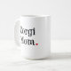 Taza blanca con el texto negro y un pequeño corazón rojo.