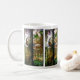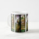 La reproducción hermosa del vitral de Tiffany de un jardín con un pavo real y algunos pájaros del loro está en esta taza.