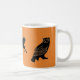 Una taza anaranjada que ofrece un tridente, un Pegaso, y un búho.