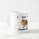 Una taza con las palabras "amo mi Pomeranian" con una imagen de un Pomeranian en el centro, su parte de una serie de tazas que ayuden a gente expresen su amor para su perro