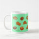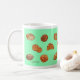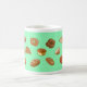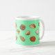 Taza con diseño alegre del dibujo del pan. Fondo verde claro. Esta taza de café con 17 diversos dibujos originales del pan y de los pasteles aclarará su mañana y tarde. Hace un gran regalo para sí mismo u otros para cualquier ocasión.