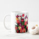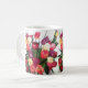 Una taza brillante y hermosa para su café o té; llenado de los tulipanes para añadir a su alegría de la mañana. Los tulipanes rojos, rosados, amarillos y púrpuras adornan esta taza del artista Claire M Carlson.