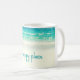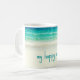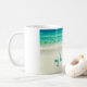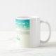 Esta taza de la playa ofrece una fotografía del océano azul que calma con las ondas apacibles que ruedan sobre la arena blanca.