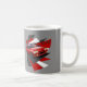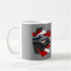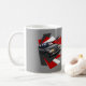 El diseño ilustrado altamente detallado de la taza de café de una Citroen roja y gris oscuro BX 16V imprimió por ambas partes con el fondo gris. Ilustrado y diseñado por mí mismo. Fondo intrépido a cada imagen usando los paneles de "estallido" rojos, blancos y gris oscuro. Texto simple que indica el modelo de los coches. Gran artículo para cuaesquiera fans o los dueños de BX 16V.