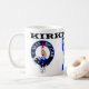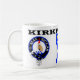 Una taza de Kirkpatrick con la insignia de Kirkpatrick en dos idiomas diferentes.