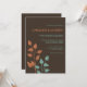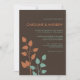 Estas simples, elegantes y modernas invitaciones nupciales están listas para personalizar y presentan dos boughs, o ramas de hojas en naranja y verde azuladas en un fondo de chocolate. Estas invitaciones temáticas de rama/hoja son ideales para bodas de otoño o otoño.