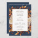Caída de la Marina AzulTerracotta deja la invitación a la boda. Esta elegante invitación a la boda incluye hermosas acuarelas pintadas a mano, naranja quemado, cobre, hojas de terracota, dahlias crema y beige, y hermosos rosas rojos y marrones sobre un fondo azul marino, ¡perfecto para un boda de otoño! La parte trasera de la invitación tiene una hermosa rama de hojas con el monograma de la novia y el novio. Encontrar elementos coincidentes en la colección de Bodas de la Marina Blue Autumn Romance.