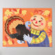 Un pájaro de pavo colorido, y una visita cordial de espantapájaros en un día de otoño. Las hojas de siena de limón amarillo y quemada enmarcan la escena. Ilustracion original de Noël Snow.