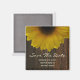 Una boda en otoño salva el imán de fecha con una imagen de un girasol amarillo mirando desde arriba sobre un fondo de madera de pino. Personalice el texto. Busque invitaciones a bodas coincidentes, tarjetas rsvp y más en The Pink Schoolhouse.
