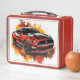 Esta caja de almuerzo se muestra con una impresión artística de un muscle car elegante.