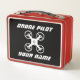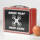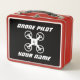 Caja de almuerzo de personalizado para un pequeño piloto de drones. Caja de almuerzo metalizado de estilo retro con el nombre del niño. Personalizado de ideas para regalo para niños y chicas que van a kindergarten y preescolar. Almuerzo metálico clásico con mango. Idea de regalo de cumpleaños o feriado para hijo, nieto, hija, sobrino, etc. Añade tu propio nombre, equipo, iniciales de monograma o cita graciosa. Disponible en muchos colores. Tipografía deportiva cursiva. Color de fondo personalizado.