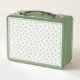 Caja de almuerzo metalizado retro verde sabio con un encantador y minimalista patrón botánico con nichos lilac simples, esparcidos delicadamente sobre un fondo blanco de lino fino.