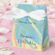 Qué maravillosa caja de favores partidarios personalizada para un cumpleaños número 75 u otra ocasión. Esta caja de favores está decorada con un fondo azul y amarillo pastel y pequeños corazones rosas. En el frente, Nombre y Título del evento en azul profundo. Al frente y al revés "Gracias por celebrar con nosotros" (o tu texto personalizado). Una cinta blanca aporta un toque festivo. Moderna, elegante y de moda. Todos los derechos reservados © 2015 Alan & Marcia Socolik.
