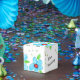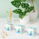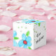 Elegante caja de bienvenida con estampado floral azul acuático, con una rúbrica de rojo, personalizable con tu mensaje para tu día de boda, o cualquier ocasión especial. El texto se puede personalizar, o el texto se puede eliminar. El fondo blanco se puede cambiar a cualquier color para que coincida con los colores del evento.