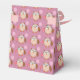 Esta impresionante caja de favores presenta una linda lechuza marrón con grandes ojos adormilados. El búho sostiene un globo rosa pálido de bonito y un ramo de flores rosas brillantes envueltas en un cono rosa pálido.