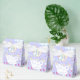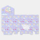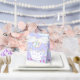 El diseño tiene un fondo de lavanda con cabezas blancas de unicornio que tienen formas de flujo rosa, azul y amarillo pastel. Diseminadas por todas partes están las nubes onduladas de un perfil azul, los corazones rosados y las estrellas amarillas. Los elementos están dispuestos en un patrón impecable y caprichoso. El estilo general es de ensueño y de fantasía.