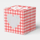 Corazón blanco con nombres de recién casados sobre fondo a cuadros rojos y blancos.