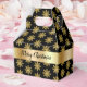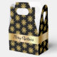 Esta elegante caja de favores es negra con un hermoso patrón de copos de nieve de color dorado. En el medio de la caja hay una banda ancha de color dorado. En la parte delantera y trasera el texto dice "Feliz Navidad". Este texto se puede personalizar.