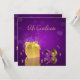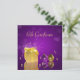 Glamoroso ilustracion de Navidades mágicos: Encantadora caja de regalo dorada al lado del oro y bolas de árbol de navidad morado y perlas doradas en un elegante fondo morado.
