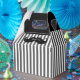 Elegante caja de regalo de los padrinos hecha con un patrón rayado gris y blanco, con mangos negros. Gráficos de un bigote negro, en el frente, tiene texto blanco leyendo Gracias. Estupenda caja de regalo para ese pequeño y especial regalo de agradecimiento a tu mejor hombre y padrinos. Estupenda caja de regalo para nuestros frascos de 6 onzas.