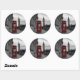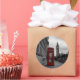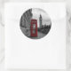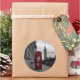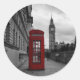 Pegatina fotográfico circular de recuerdo con una foto selectiva en color de una caja de teléfono roja en el centro de la ciudad de Londres, Reino Unido, con el Big Ben al fondo el Día del Recuerdo.