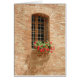 Una ventana arqueada vieja fijó en una pared de ladrillo vieja con las flores rojas que adornaban la caja de ventana