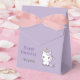 Caja de Favor de Cumpleaños Morado con un lindo Unicornio y puntos de polka para un paquete de regalo personalizado. Otro unicornio está impreso en la parte posterior.