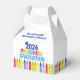 This customized 2026 preschool graduation party favor box features a cool grad cap above colorful writing and a row of crayons in rainbow. Cute PreK graduate design in fun colors. Congratulations to our Pre-K graduates!