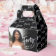 Forty silver script two photos party favor boxes. Personalize this 40th birthday party script photo favor box with your own birthday girls name and two photos of your birthday girl or boy one on each side. Other years and matching items are available and can be created by request. © Original design by Sarah Trett for www.mylittleeden.com on Zazzle.