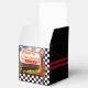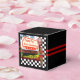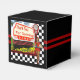 Caja cuadrada de favores de estilo clásico negro con una imagen, en la parte delantera y trasera, de un cartel de comedor retro de los años 50 que dice, "Gracias por venir", un reloj de cena rojo, y un vintage servidor femenino de los años 50 en un tablero de ajedrez en blanco y negro. Dos franjas rojas rodean la caja. Vea las invitaciones a la tarjeta coincidente, "50s Retro Diner" y "Rótulo Retro Diner Blank de los 50s", sobre, bolsa de favores, etiqueta, y pegatinas. Vea toda la colección Nifty 50s Favor Box en los TOUCHES ESPECIALES | Sección de favoritos de partido.