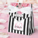 Un favor para una fiesta de cumpleaños número 60. Bandas verticales clásicas en blanco y negro como fondo. Con flores rosa femeninas y femeninas, rosas como decoración. Con el texto: ¡Gracias! Marco blanco y negro en la parte delantera con plantilla para la edad, el nombre y la fecha. Edad número 60 en rosa, nombre y fecha en negro. El nombre se escribe con un guión de estilo con letras a mano.