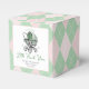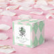 Estas lindas cajas de regalo de "Lucky Little Gracias" femeninas cuentan con un carrito de bebé victoriano irlandés de moda, adornado con un shamrock y suaves tonos verdes, todo en contra de un adorable patrón de estilo de argyle rosa y verde. Personalice con detalles del evento. Impreso delante y atrás. Estas cajas de regalo son de la colección de duchas para bebés "A Lucky Little Shamrock".