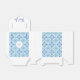 Agregue un encantador toque costero a su despedida de soltera con esta caja de favores de azulejos mediterráneos, que presenta arte de azulejos pintados a mano con acuarela en la parte delantera y trasera. La solapa abatible incluye un guión de "Gracias" de cobalto profundo con una segunda línea personalizable, y la parte posterior se puede personalizar con el nombre de la novia o los detalles del evento. Terminada con una dulce cinta blanca, esta pequeña caja de tienda es perfecta para dulces, pequeños regalos o favores para llevar a casa llenos de corazón.