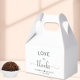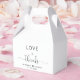 Elegante caja de favores matrimoniales con "amor + gracias" en una simple tipografía moderna y un guión elegante, tus primeros nombres unidos por un corazón y tu fecha boda.